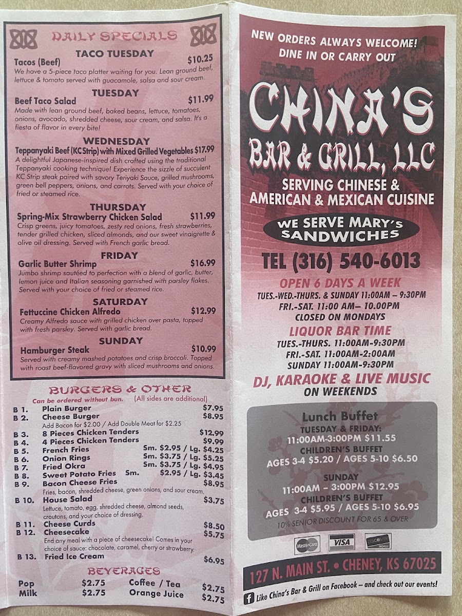 Welcome to China's Bar & Grill LLC., a hidden gem on 127 N Main St, Cheney, KS, where the charm of a family-owned eatery meets a diverse menu brimming with flavor. The culinary offerings here are a delightful blend of Chinese and American favorites, providing options for every palate.